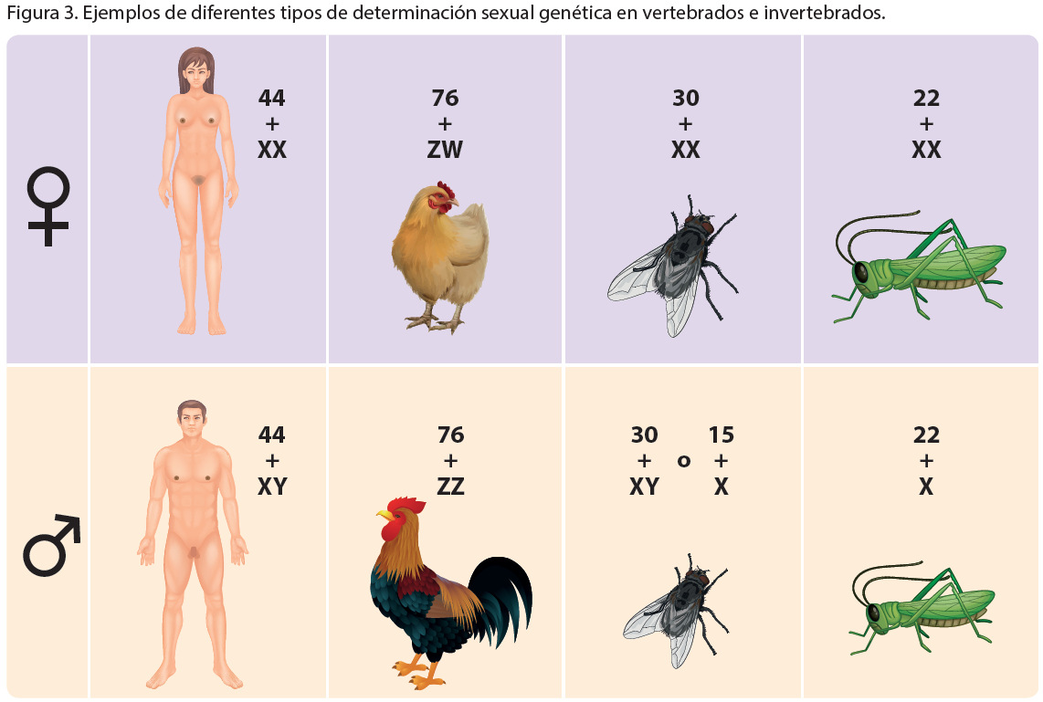 En la mayoría de especies animales, la diferenciación sexual20 viene determinada genéticamente. En estos casos, el sexo de un individuo viene determinado por un cromosoma21, un gen22 o un alelo23 concreto que provocará la diferenciación hacia un sexo u otro. Entre los vertebrados, existen dos tipos; el sistema XX/XY en mamíferos (en el que XX es una hembra y XY es un macho) y, el sistema ZW/ZZ en aves y algunos peces (ZW corresponde a una hembra y ZZ a un macho).