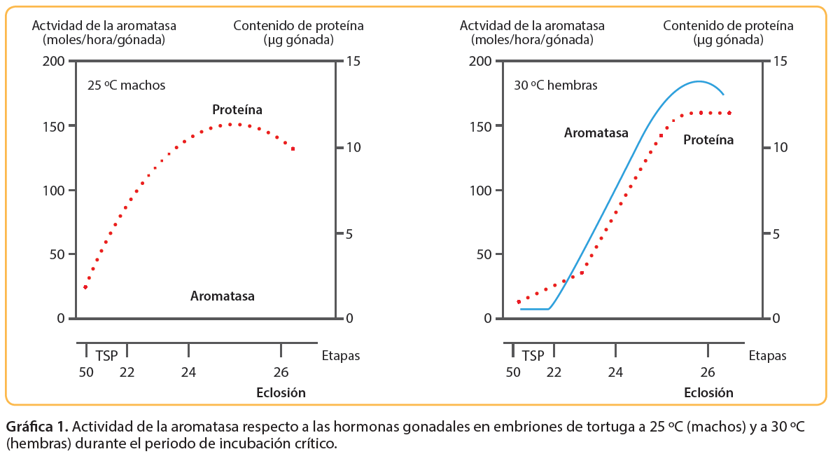 La temperatura durante el período de incubación crítico altera la función de la aromatasa, hormona que convierte los andrógenos (hormonas masculinizadoras) en estrógenos (hormonas feminizadoras), ambas hormonas gonadales. A temperaturas que dan lugar a machos, la actividad de la aromatasa se inhibe, mientras que a temperaturas que dan lugar a hembras, la actividad de la aromatasa se mantiene. Experimentos en los que se alternan diferentes temperaturas durante el desarrollo embrionario han demostrado que la determinación del sexo ocurre en el período de incubación crítico por un efecto acumulativo de la temperatura de incubación (es decir, que la determinación del sexo durante el período de incubación crítico depende de las temperaturas que previamente experimentó el embrión).